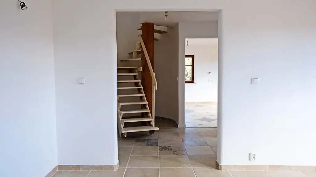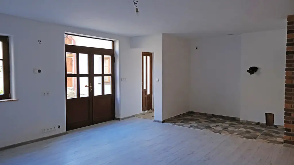 - 1.hlavní vchod (dolní vstup z ulice), vstupní chodba, velký obyvací pokoj (příprava pro krbová kamna) se vstupem na uzavřený dvůr (63 m2) a sam.WC + umyvadlo, ložnice s vlastní koupelnou (sprchový kout + umyvadlo) a příprava pro krbová kamna, 2.vchod do domu, prostor připravený pro kuchyni s posezením, dřevěné schodiště do 1.patra