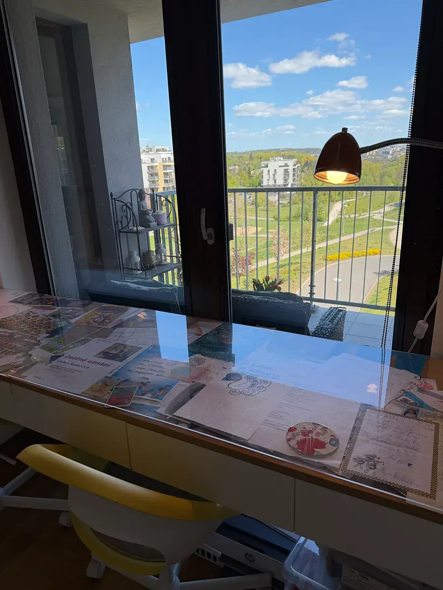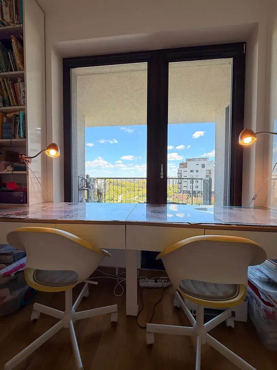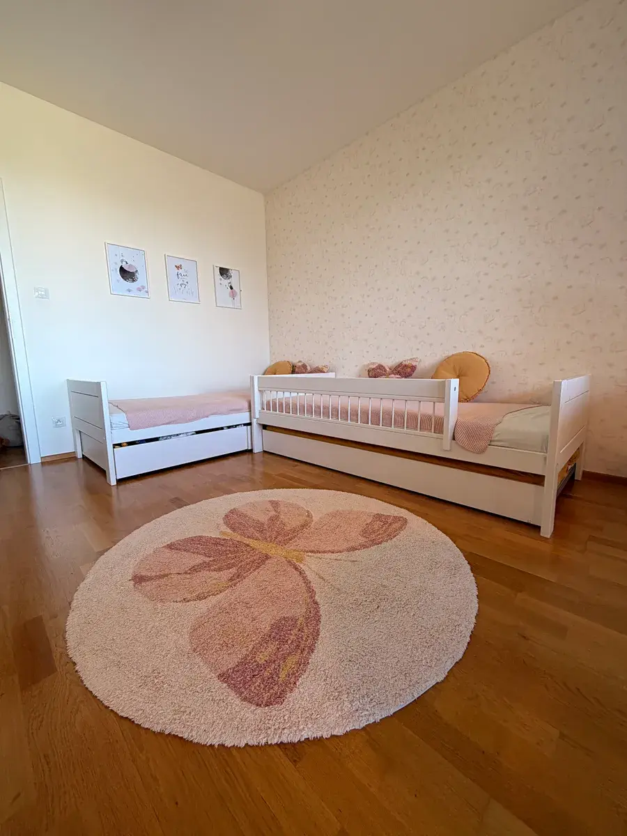 Dominantou dětského pokoje je kompletní vestavěná sestava na míru, která je součástí prodeje – dva velkorysé psací stoly v provedení wall-to-wall, dvě knihovny až ke stropu, velká zrcadlová vestavěná skříň s dostatkem úložného prostoru pro dvě děti a moderní designové tapety. Pokoj je navržen tak, aby plnohodnotně sloužil jako dětský pokoj, studentský pokoj i komfortní domácí pracovna pro home office, což ocení zejména rodiny s flexibilním pracovním režimem.