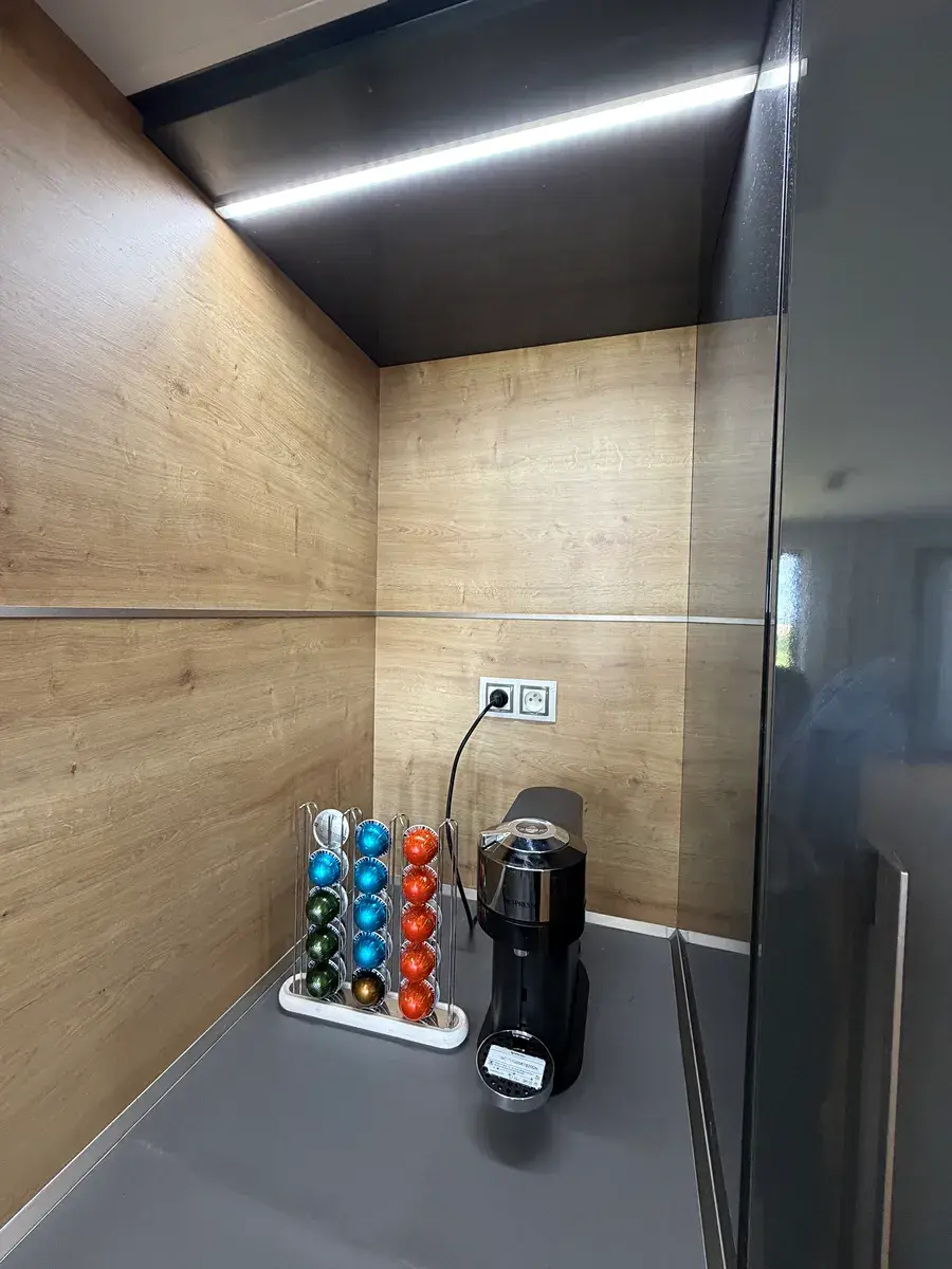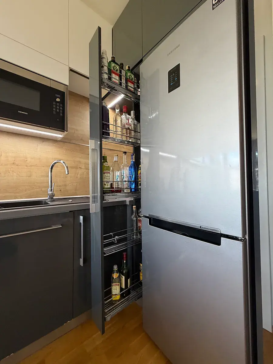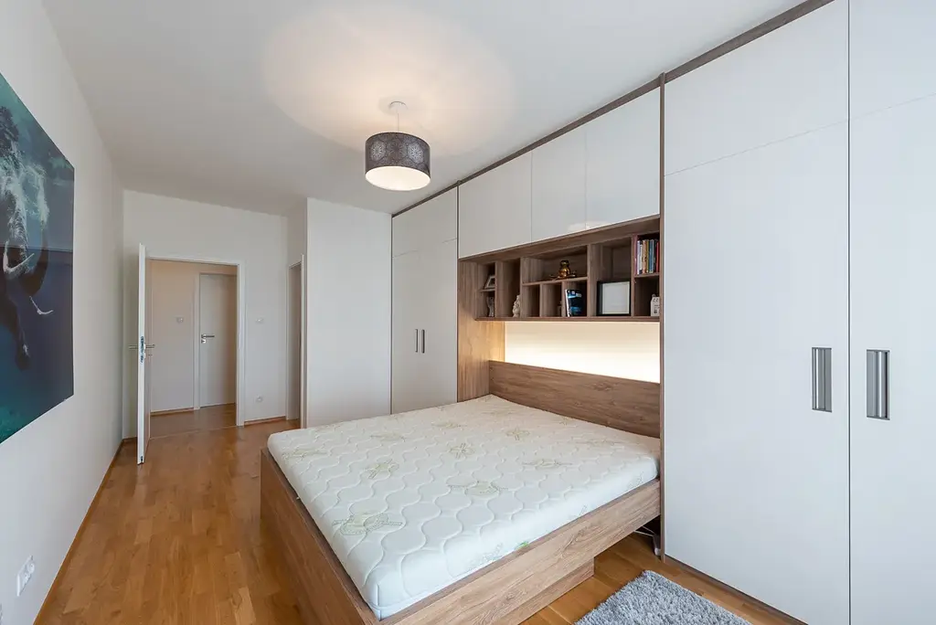 Interiér bytu byl navržen s důrazem na detail, kvalitu materiálů a maximální funkčnost. Velkou předností je mimořádné množství vestavěných úložných prostor, díky nimž působí celý interiér čistě, elegantně a vzdušně, přestože pohodlně pojme vše potřebné pro rodinný život.