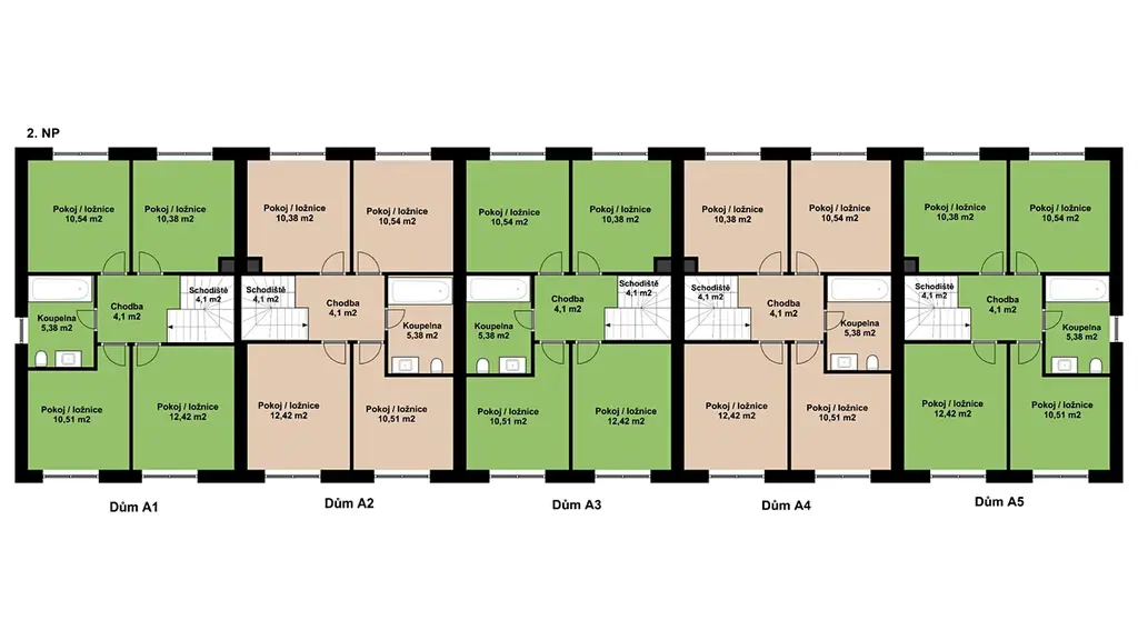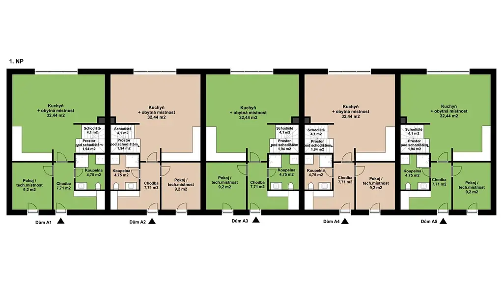 Každý dům má zastavěnou plochu 71 m² a celkovou užitnou plochu 114,5 m²
