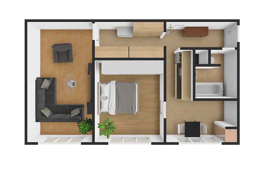 Dispozice: předsíň s úložnými prostory, obývací pokoj, ložnice, kuchyně s jídelním koutem a koupelna s WC. K bytu náleží sklep.
