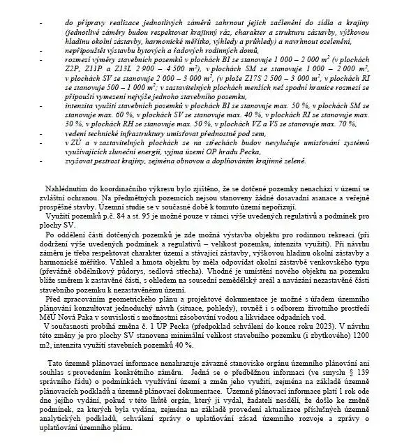Přístup na pozemek je zajištěn po zpevněné cestě. Dle platného územního plánu je možné pozemek využít jak pro bydlení, tak pro rodinnou rekreaci, což ocení nejen rodiny s dětmi, ale i ti, kteří hledají klidné místo pro víkendové úniky z městského shonu. Intenzita využití zástavby je stanovena na 40 %, což poskytuje dostatek prostoru pro realizaci vašich představ o ideálním bydlení.