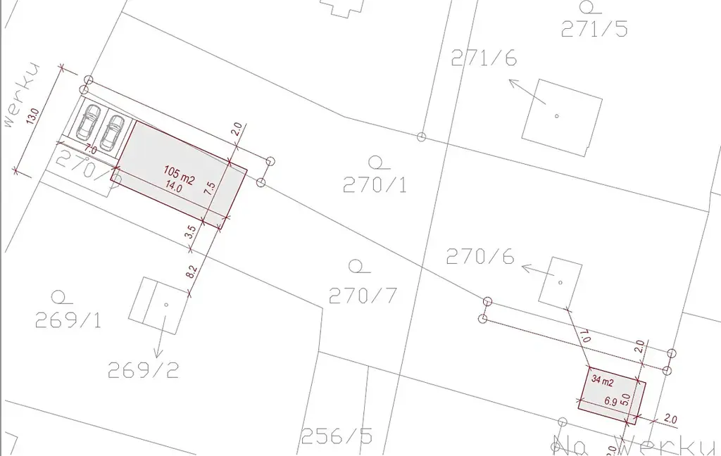 Na pozemku je možné umístit stavbu rodinného domu o zastavěné ploše až 105 m2 a až dvou podlažích s obytným podkrovím + vedlejší stavba 34 m2, podle přiložené architektonické studie. Současná hranice pozemku je upravena geometrickým plánem podle přiloženého plánu.