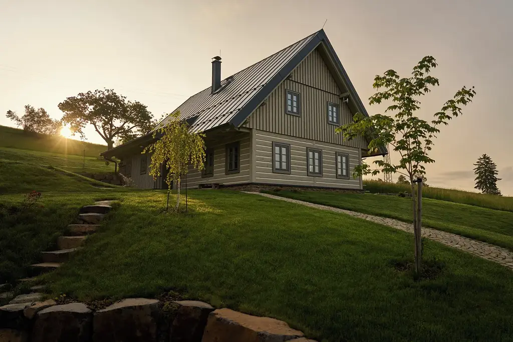 Tepelná čerpadla Daikin (voda–vzduch), trojitá dřevěná okna, dlažba a vinylové podlahy