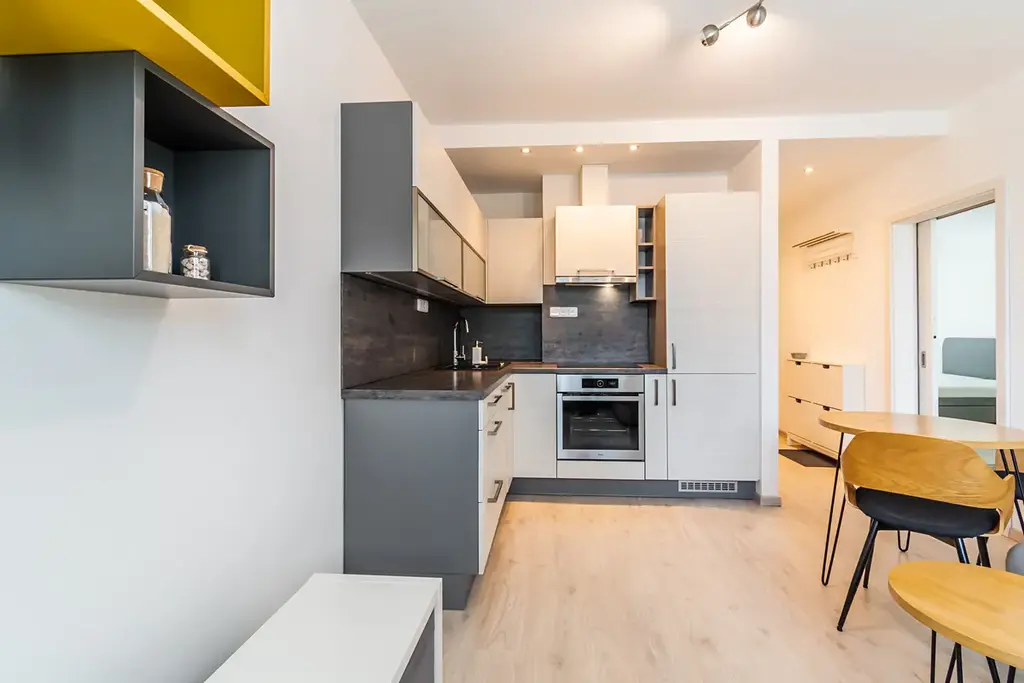 Byt prošel pečlivou a vkusnou rekonstrukcí a je kompletně zařízený designovým nábytkem, který poskytuje komfortní a moderní bydlení bez nutnosti dalších investic.