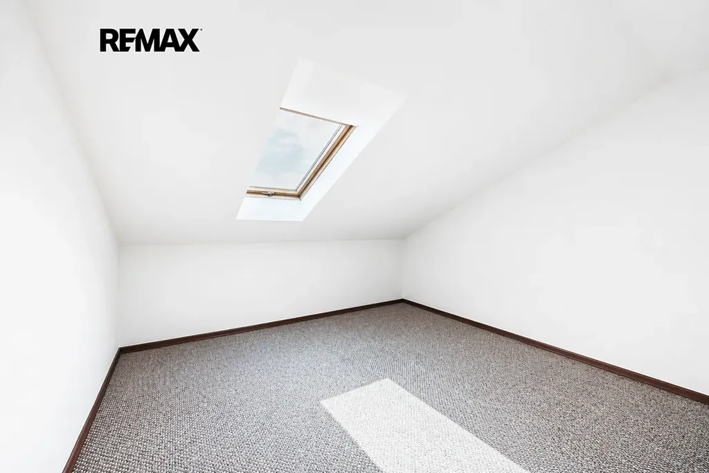 Horní patro nabízí další dva pokoje a multifunkční místnost, která může sloužit jako prostorná šatna, případně zde vznikne budoucí druhá koupelna. Vzdušná podesta se schodištěm elegantně propojuje obě obytné úrovně a díky dennímu světlu ji lze využít také jako čtecí kout, pracovnu nebo relaxační zónu.