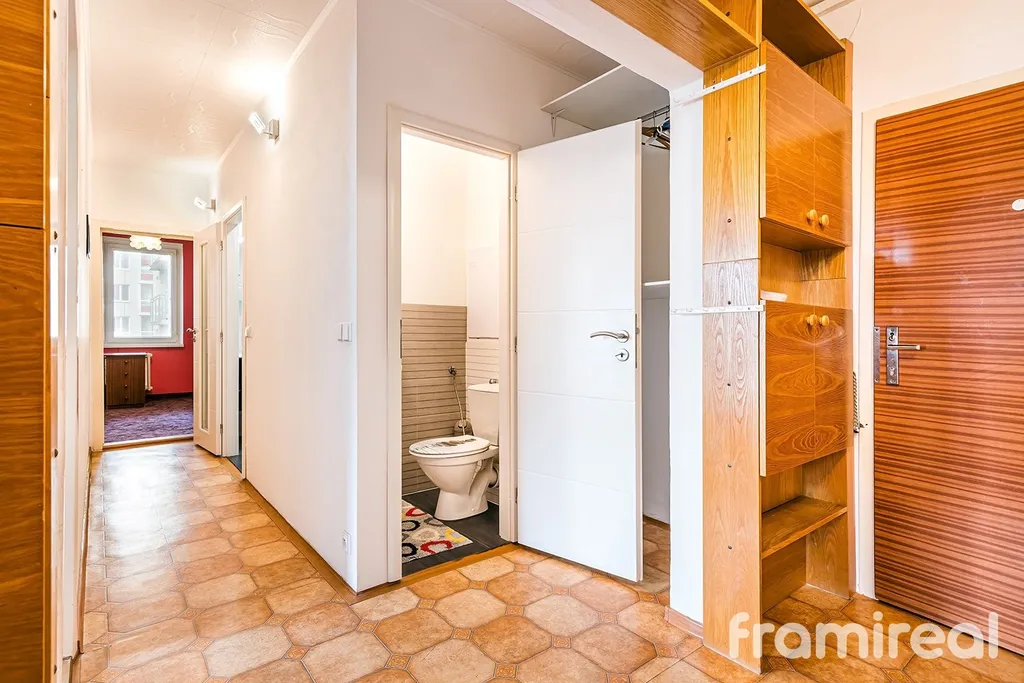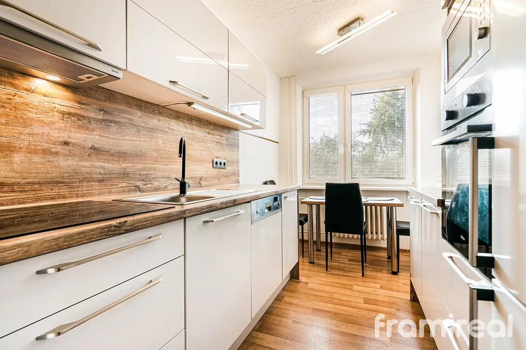 Z ní je přístup do dvou komor, do zrekonstruované kuchyně vybavené moderními spotřebiči, do zrekonstruované koupelny s vanou i sprchovým koutem, do obývacího pokoje a do samostatné ložnice.