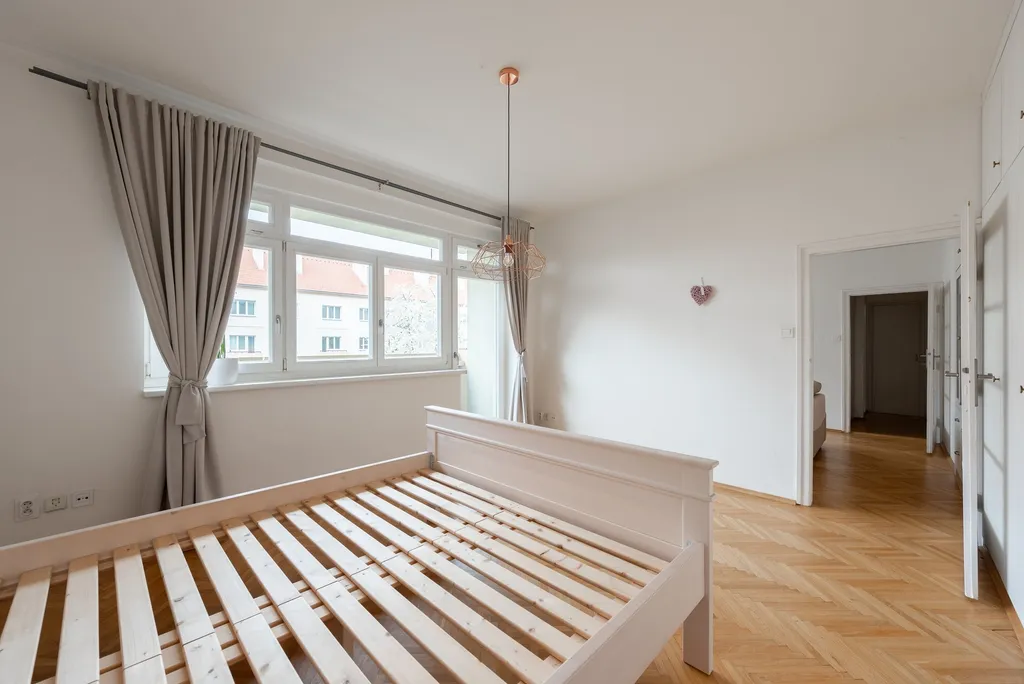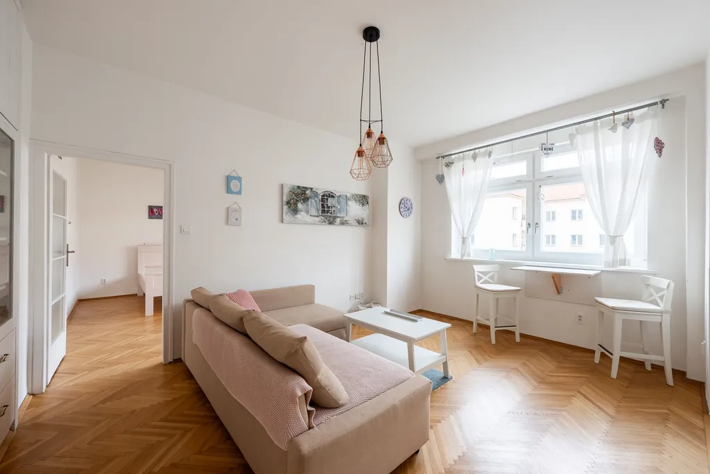 Interiér prošel rekonstrukcí a poskytuje komfortní bydlení. Na podlahách jsou parkety, okna jsou plastová a vytápění je řešeno podlahovým topením. Byt je laděn do elegantních krémových tónů a disponuje vestavěnými skříněmi s dostatkem úložného prostoru. Součástí bytu je také praktická komora. K dispozici je sedačka v obývacím pokoji a postel v ložnici (bez matrace).