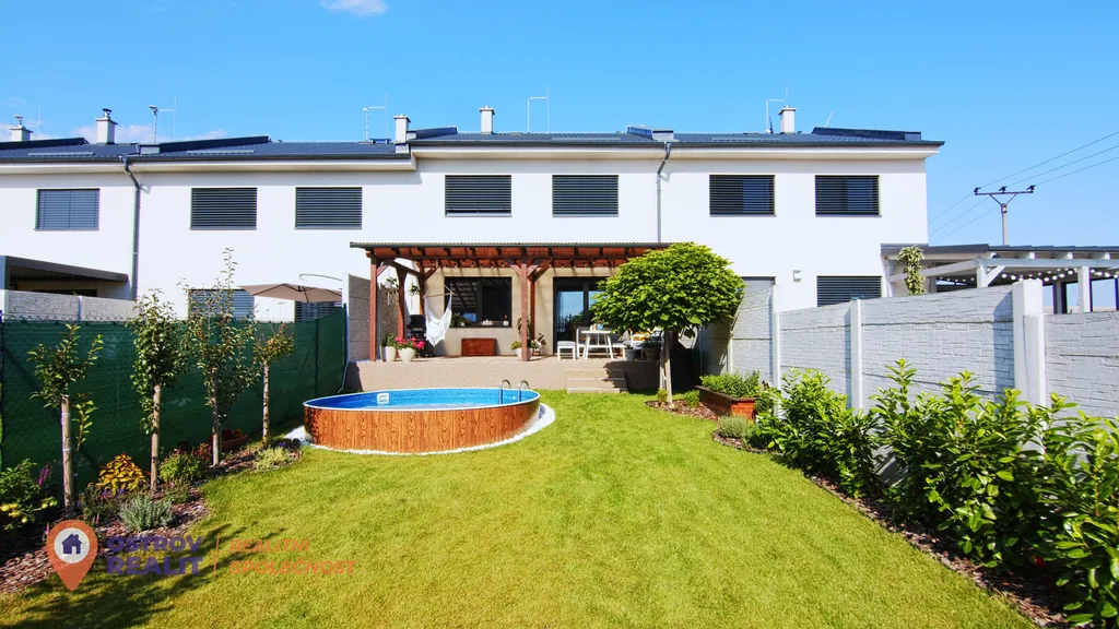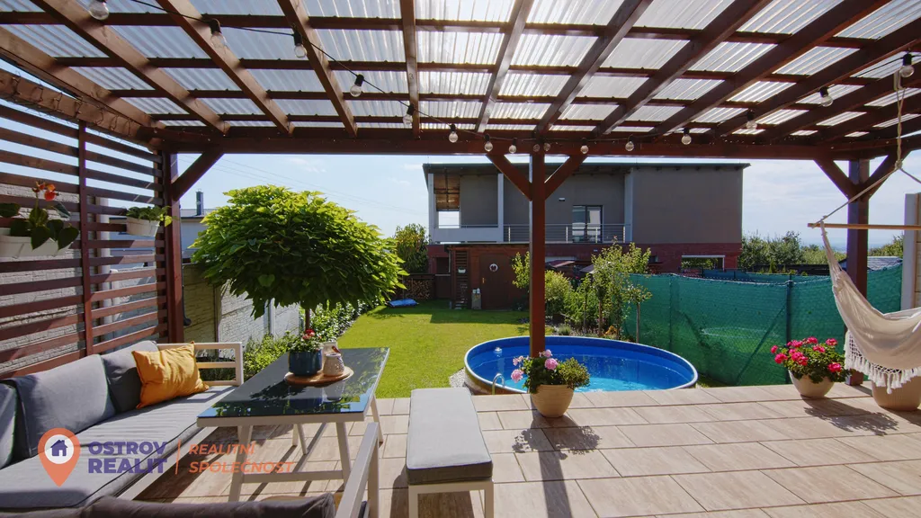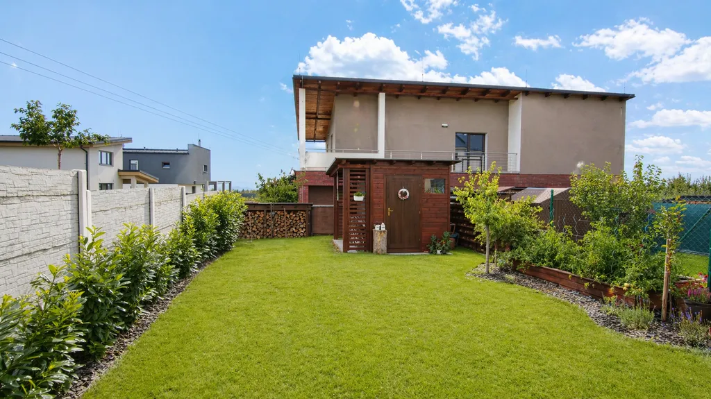 Zahrada je navržena jako přirozené pokračování domu. Nabízí zastíněnou terasu, bazén, zahradní domek s elektřinou, dřevník i automatickou závlahu. Je to místo, kde si užijete klid, soukromí i čas s rodinou – od ranní kávy až po večerní posezení.
