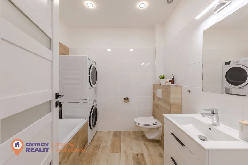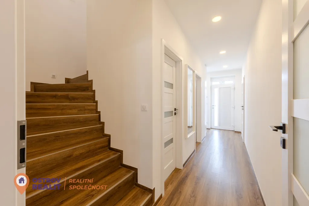 Velkým benefitem je prostorná garáž s přímým vstupem do domu, díky které se dostanete domů pohodlně a suchou nohou. Další parkování je možné na příjezdové cestě před domem. Nechybí ani praktická komora pod schody a koupelna se sprchovým koutem a toaletou.