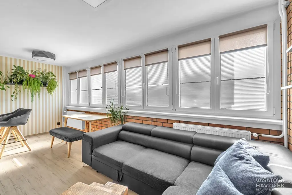 Dispozici bytu tvoří kuchyň propojená s obývacím pokojem, orientovaná na jihozápad. Dva pokoje, koupelna s vanou a záchodem je situována na severovýchod. Okna v této části bytu směřují do klidného vnitrobloku s parkem a dětským hřištěm. V předsíni je zhotovena vestavěná šatní skříň, která plní funkci šatny a zároveň nabízí prakticky řešený úložný prostor. V obytných místnostech jsou podlahy řešeny kombinací vinylu a plovoucí podlahy, v koupelně je položena keramická dlažba. V koupelně je instalováno podlahové vytápění.