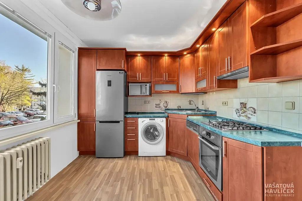 Dispozice: vstupní chodba, prostorný obývací pokoj, tři samostatné neprůchozí pokoje, kuchyň, koupelna se sprchovým koutem, samostatná toaleta a lodžie. Podlahy tvoří kombinace dlažby, plovoucí podlahy, linolea a koberců.
