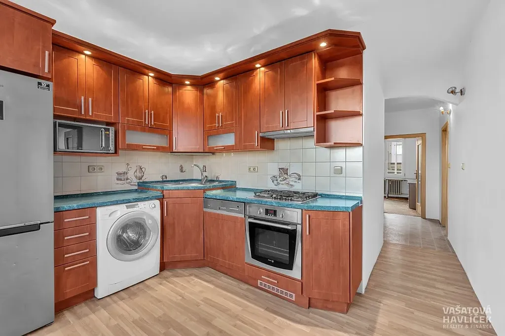 Vytápění i ohřev vody zajišťuje ústřední topení. Součástí bytu je kuchyňská linka s vestavěnými spotřebiči (trouba, plynová varná deska, digestoř, myčka a pračka), vestavěná skříň v chodbě a praktická vyvýšená postel s úložným prostorem v jednom z pokojů. Po dohodě je možné ponechat i další vybavení, například mikrovlnnou troubu či lednici. K bytu náleží jedna sklepní kóje o výměře 5,3 m² a dále společná větší sklepní kóje sdílená se sousední bytovou jednotkou. K dispozici jsou také společné prostory, jako je kočárkárna a kolárna.
