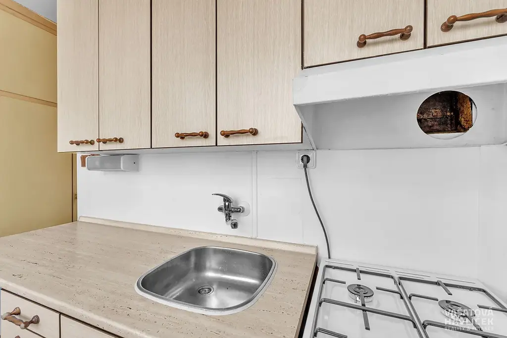> kuchyňská linka se spotřebiči (nová plynová trouba se sporákem, malá lednice, digestoř)