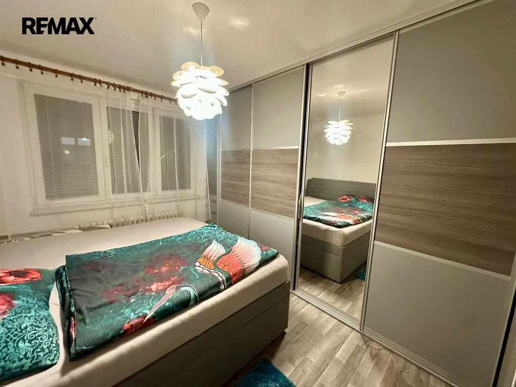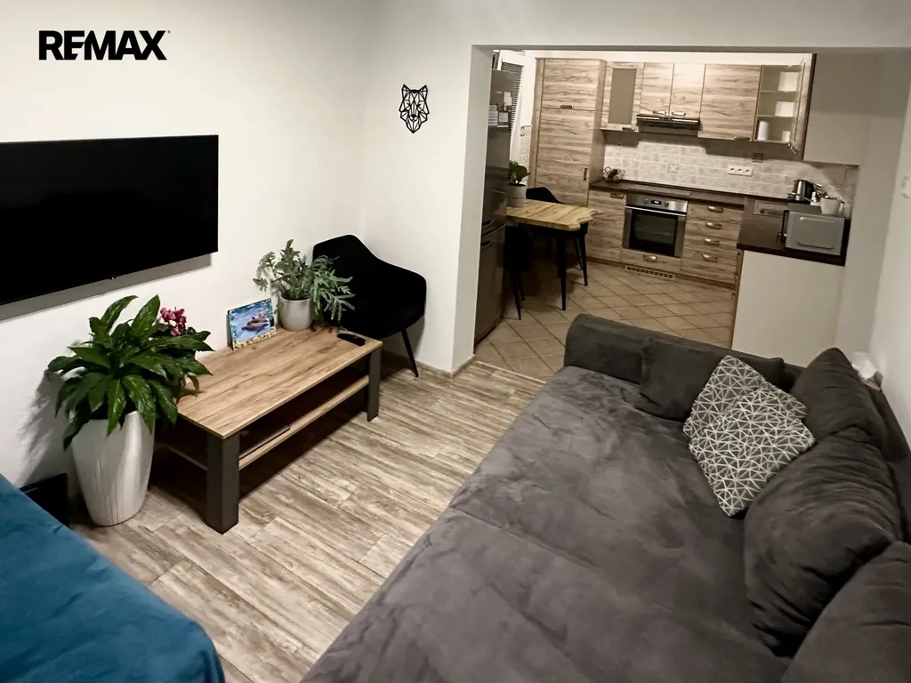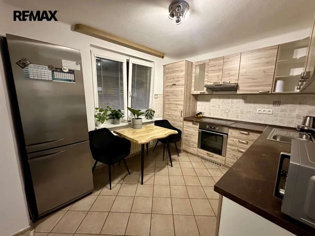 Byt se skládá z předsíně, ložnice s vestavěnou skříní, dalšího samostatného pokoje a obývacího pokoje s kuchyňským koutem, kde zůstává kuchyňská linka vybavená sporákem, indukční varnou deskou, digestoří a myčkou. Součástí vybavení je i lednička s mrazákem. Koupelna a toaleta jsou oddělené, a na chodbě je k dispozici další vestavěná skříň, která poskytuje spoustu úložného prostoru.