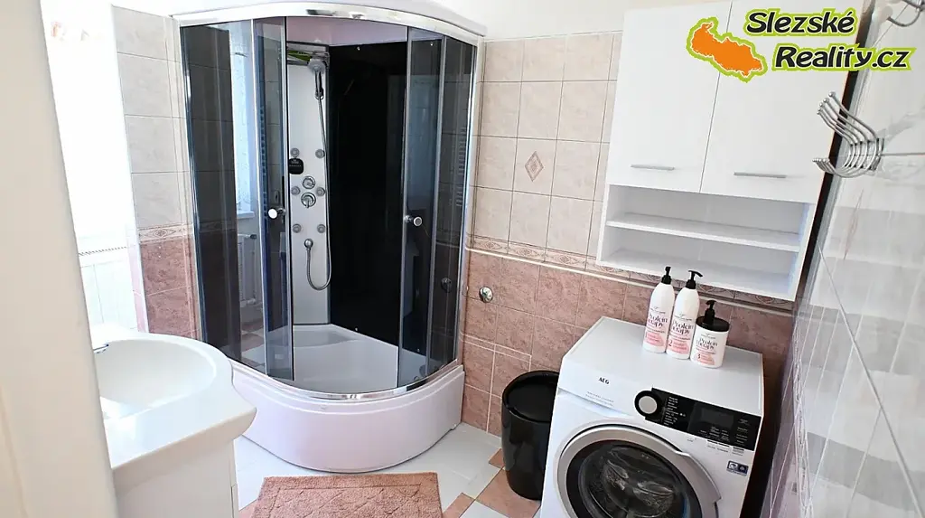 V patře se nachází druhá bytová jednotka o dispozici 3+0, která zahrnuje obývací pokoj s lodžií, dva samostatné pokoje, koupelnu s toaletou a další koupelnu se sprchovým koutem.