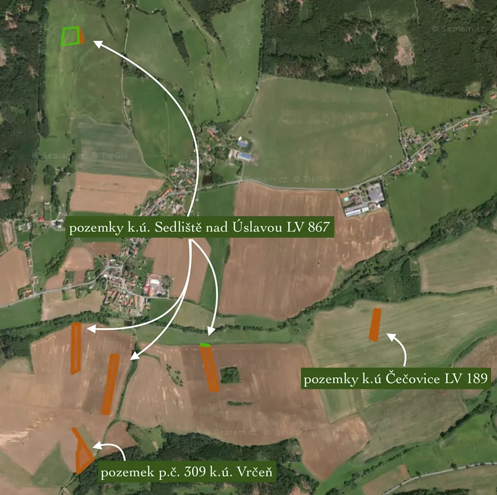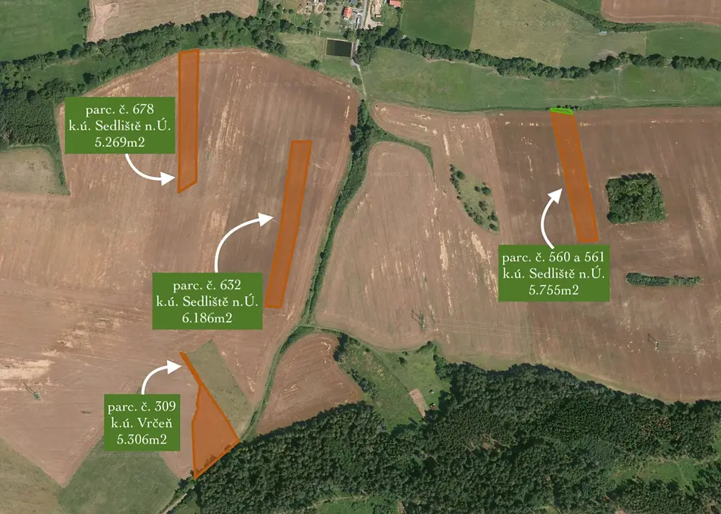 Nabízíme ke koupi soubor zemědělské půdy o celkové výměře 30.508m2 nacházející se v katastrálním území Sedliště nad Úslavou zapsané na listu vlastnictví č. 867 (22.558m2), kat.území Čečovice list vlastnictví 189 (2.644m2) a kat.území Vrčeň parcela.č 309 (5.306m2) Pozemky jsou převážně využívané jako orná půda a jsou pronajaté místní společnosti do konce roku 2029.
