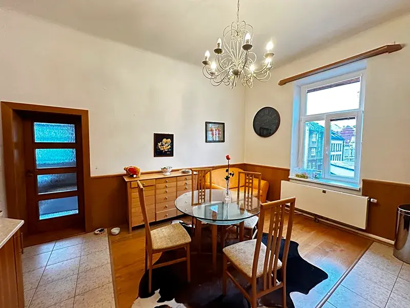 Byt je v osobním vlastnictví a je situován v 2.NP třípodlažního zděného rekonstruovaného historického domu. Celý dům i byt byl zrekonstruovaný včetně stylové vstupní chodby v domě. Byt dispozičně obsahuje vstupní chodbu, ze které jsou vstupy do ložnice, kuchyně, koupelny, samostatného WC a komory. Z kuchyně jsou vstupy do obývacího pokoje a dětského pokoje.