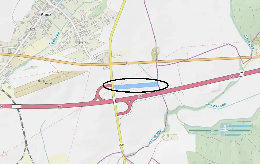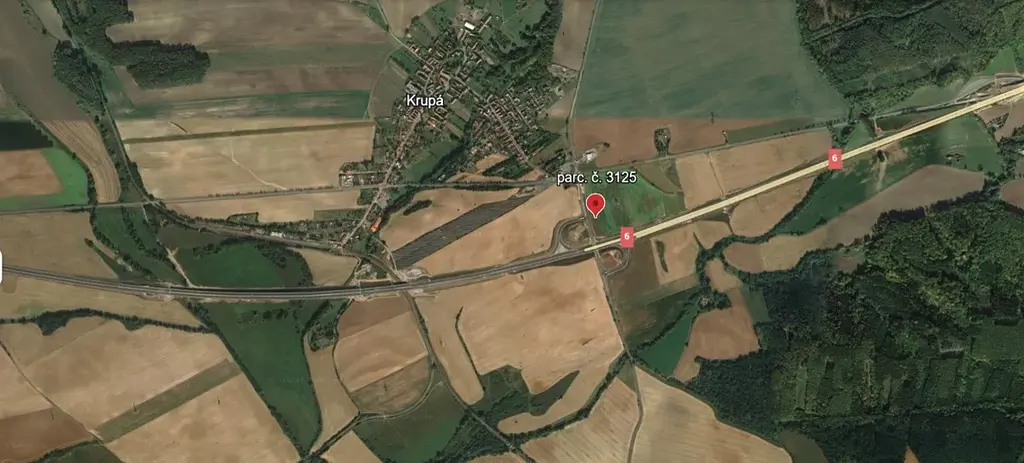 Nabízíme k prodeji parcelu č. 3125 a výměře 12.327 m2 poblíž nově vybudovaného úseku dálnice D6 - konkrétně přímo proti exitu 43. Výborná dopravní dostupnost. Pozemek je rovinatý a přístupný ze západní strany po státní cestě s parc. č. 3686. Nedaleko protéká Krupský potok.