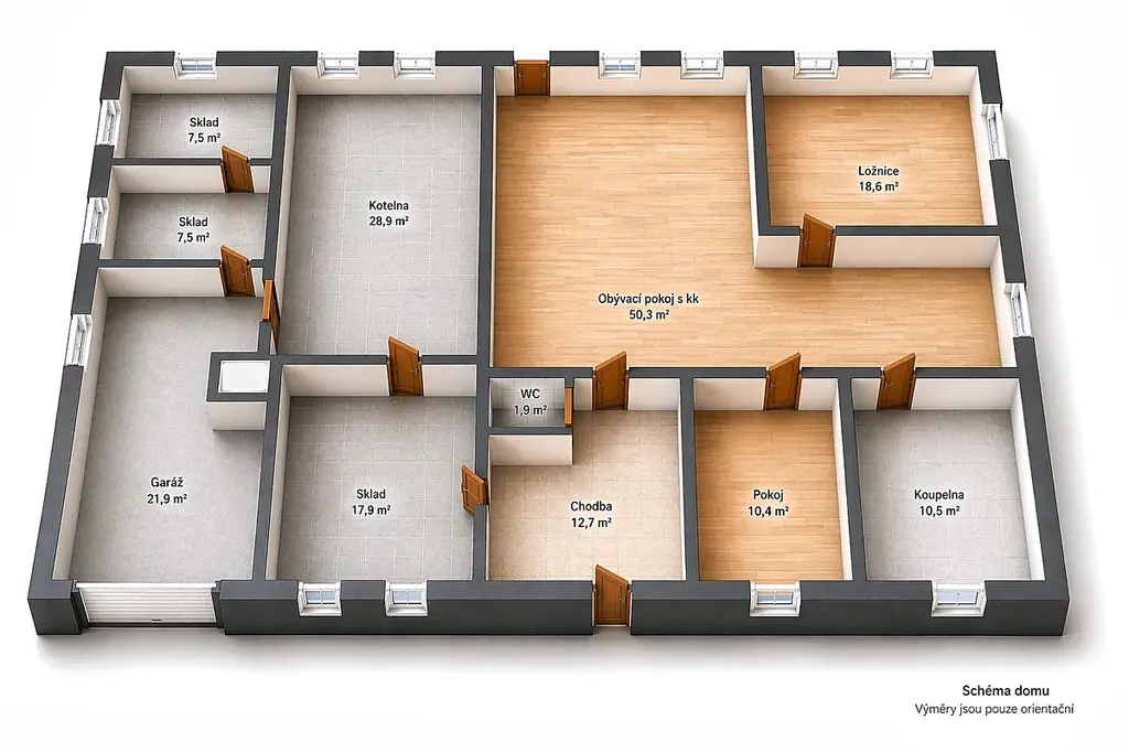 Užitná plocha přízemí je 188 m2. Velký potenciál potom naskýtá prostorná půda (cca 225 m), která je svou velikostí a výškou vhodná i pro vestavbu samostatného bytu (dvougenerační bydlení). Dům tak nabízí širokou škálu možného budoucího využití.