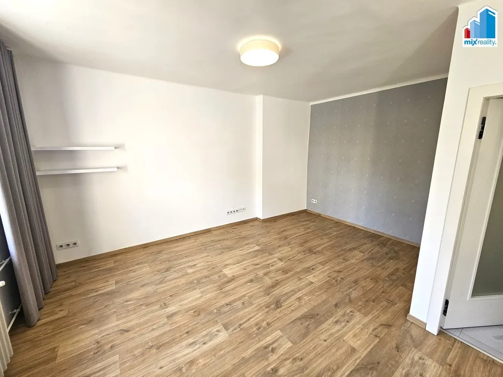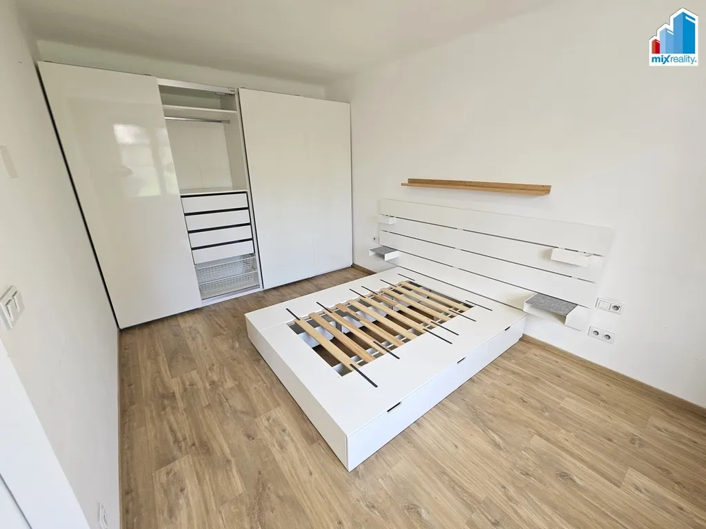 Byt je dále vybaven postelí a vestavěnými skříněmi, pohovka bude dodána.