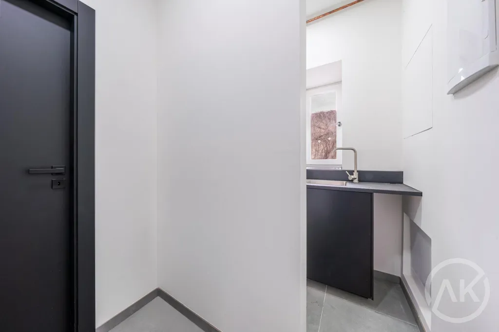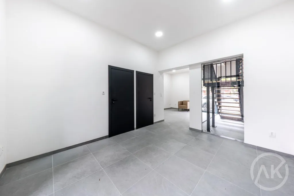 - za prosklenou stěnou je zajímavý prvek schodiště do vrchního patra, kde je byt. Ten je určen na nadstandardní, krátkodobý business pronájem. Každý den nová příležitost. Samo se to dá snadno vyřešit tak, abys vidět nebyl/a pokud nechceš,