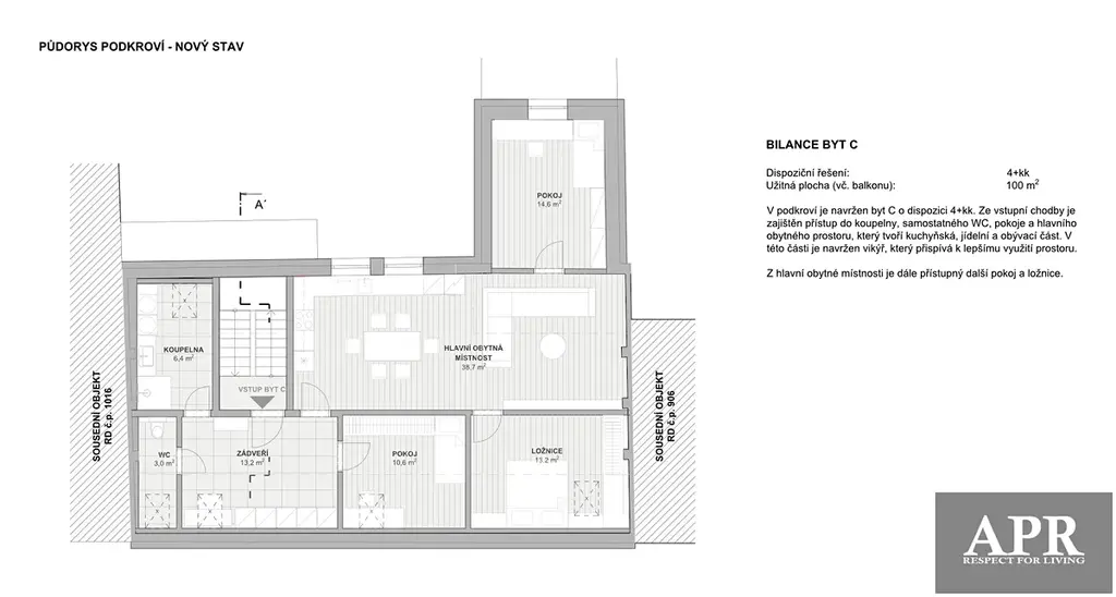 V podkroví je navržen byt o dispozici 4+kk . Ze vstupní chodby je zajištěn přístup do koupelny, samostatného WC, pokoje a hlavního prostoru, který tvoří kuchyňská, jídelní a obývací část. V této části je navržen vikýř, který přispívá k lepšímu využití prostoru. Z hlavní obytné místnosti je dále přístupný další pokoj a ložnice.