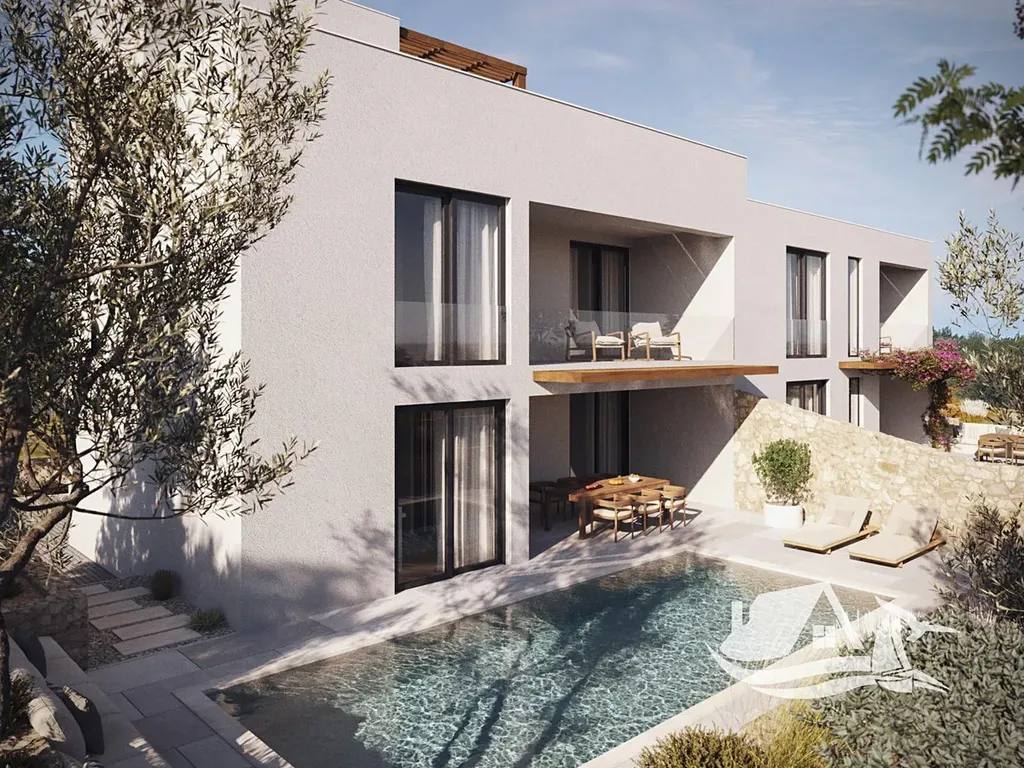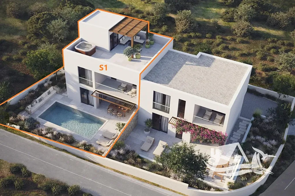 V atraktivní a klidné části města Vodice vzniká tento moderní luxusní dvojdům, který nabízí vše, co si lze od komfortního bydlení u moře představit. Nemovitost se nachází v nově vybudované rezidenční zóně obklopené rodinnými domy, přibližně 1500 metrů od pláže a 1100 metrů od centra města, takže spojuje soukromí, klid a zároveň rychlou dostupnost veškerého dění.