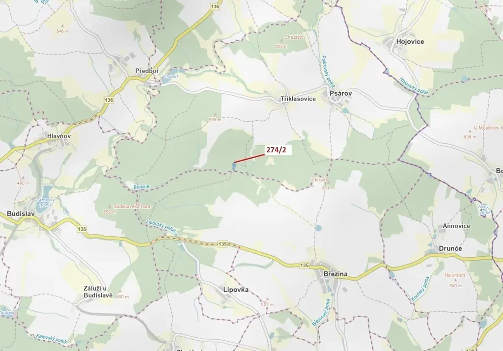 Lesní pozemek o výměře 5 348 m2, parcelní číslo 274/2, podíl 1/1, katastrální území Tříklasovice, obec Psárov, obec s rozšířenou působností Tábor, okres Tábor, Jihočeský kraj. Částečně po těžbě.