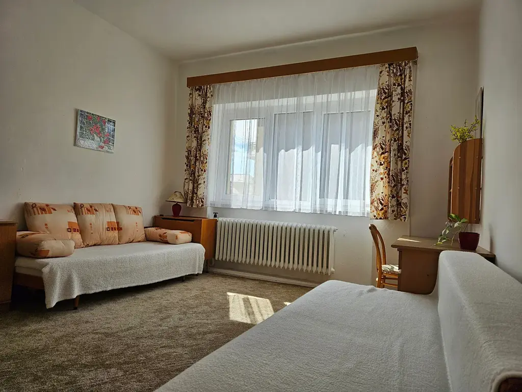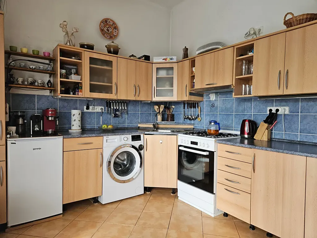 Do bytu vstupujete ze společné chodby rodinného domu, hned po vstupu se ocitnete v předsíní o ploše 12,5 m2, z které se následně vstupuje do všech obytných místností bytové jednotky. Po pravé straně od vstupu do bytu se nachází dětský pokoj o ploše 20,9 m2, vedle je umístěn obývací pokoj o ploše 29,6 m2 se vstupem na balkon o ploše 3,9 m2. Naproti vstupu do bytu se nachází ložnice o ploše 19,2 m2 s výhledem do ulice. Výhled do ulice má rovněž obývací pokoj, který má s ložnicí zároveň výhled na pozemek s garáží o ploše 25 m2. Po levé straně od vstupu do bytu je umístěna koupelna o ploše 6,5 m2 s toaletou 0,9 m2, na konci chodby je vstup do kuchyně o ploše 13 m2 se vstupem na terasu o ploše 12 m2 s výhledem do zahrady. K bytu přináleží v 1.PP sklep o ploše 27,1 m2 a druhý sklep s plynovým kotlem o ploše 21,7 m2. V mezipatře je komora o ploše 9,6 m2, která je rovněž ve vlastnictví bytové jednotky.