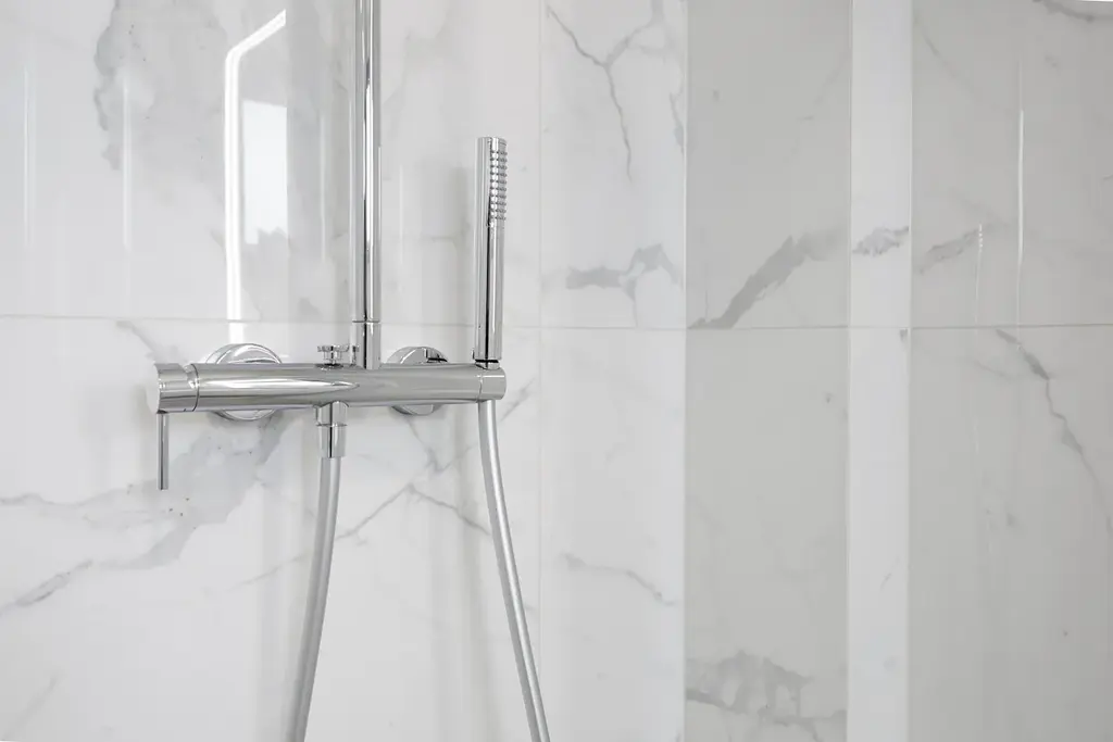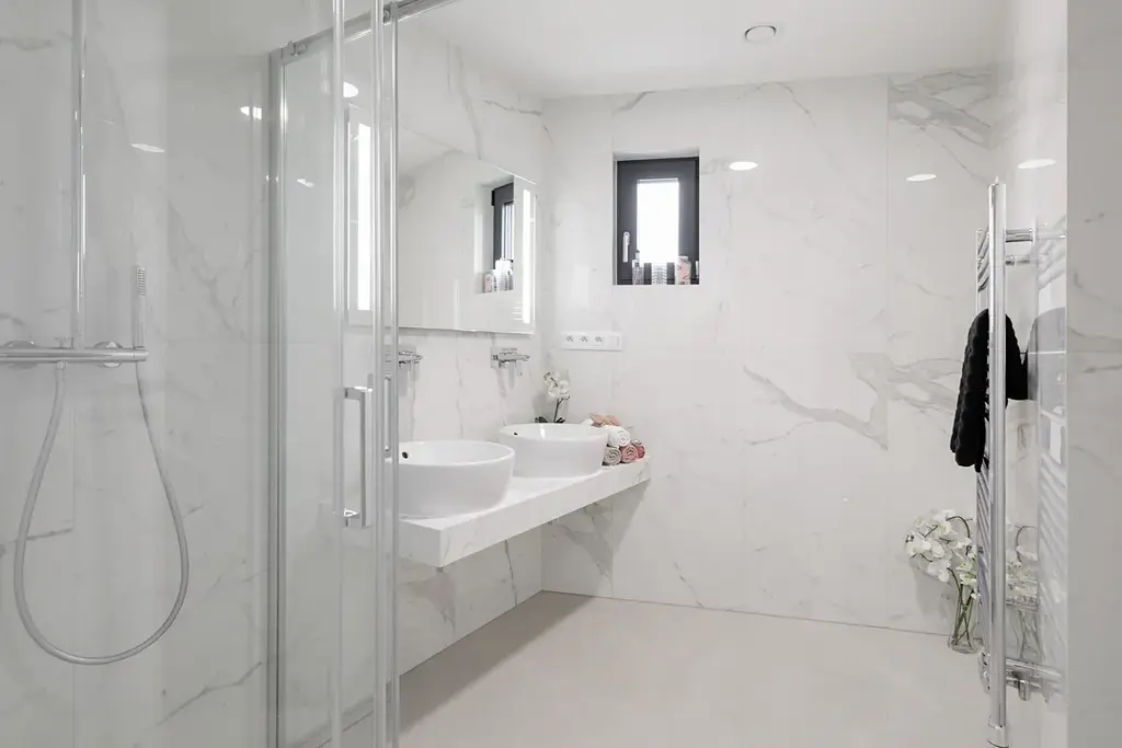 - Nízkoteplotní podlahový systém doplněný o el. topné žebříky v koupelnách
