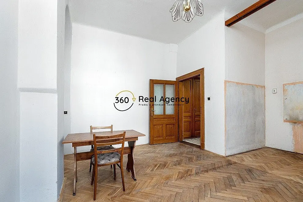 Interiér si zachoval původní charakter – dřevěné parkety připravené na renovaci dle vlastního vkusu.