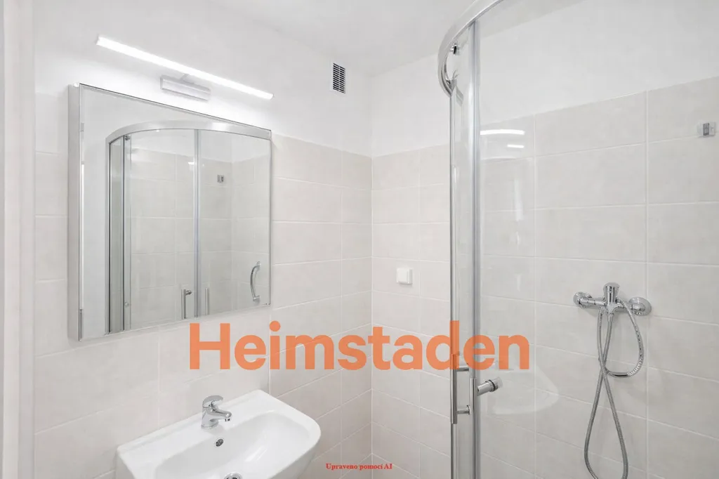 Koupelna se sprchovým koutem působí čistě a svěže, celý byt je připraven k okamžitému bydlení bez nutnosti dalších úprav.