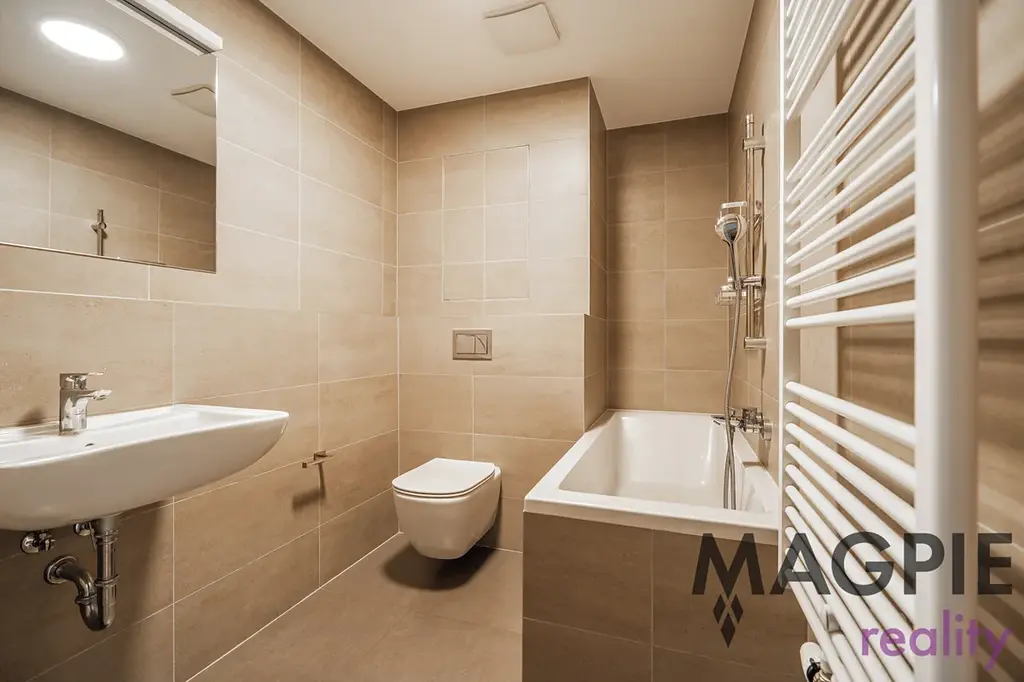 Moderně řešený byt se sestává ze zádveří (4,6 m2), z něhož vstupujeme do koupelny s WC (4,4 m2) a praktické komory (2,3 m2), kde je umístěna příprava na pračku a případně sušičku. Ze zádveří pak projdeme do obou obytných místností. Obývací pokoj (20,4m2) je vybaven moderní kuchyní na míru vybavenou značkovými spotřebiči. Výhodou jsou velká okna a vstup na lodžii. Druhou obytnou místností je ložnice (13,9m2) s dalším vstupem na lodžii, která poskytne výhled do zeleně. V ložnici je oproti fotografiím umístěna na míru vyhotovená praktická vestavěná skříň.