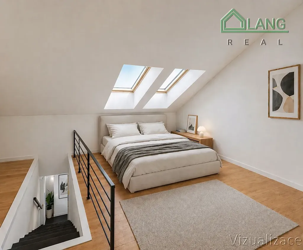 Horní patro tvoří útulná ložnice, která nabízí dostatek soukromí a oddělení klidové zóny od denní části prostoru.