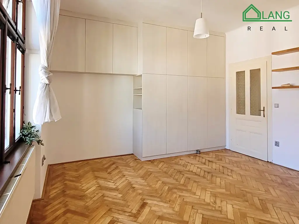 Ložnice orientovaná do ulice je zařízena vestavěnou šatní skříní po celé ploše jedné stěny, díky dvojitým novým oknům je v pokoji klid a ticho. V ložnici je dále stěna s policemi z masivu, která barevně ladí s velmi dobře udržovanými parketami.