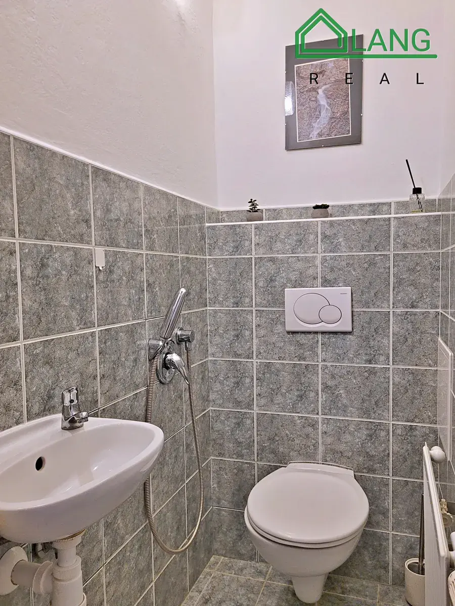 Koupelna je vybavena jak sprchovým koutem, tak vanou, skříňkami pod i nad umyvadlem a zrcadly.