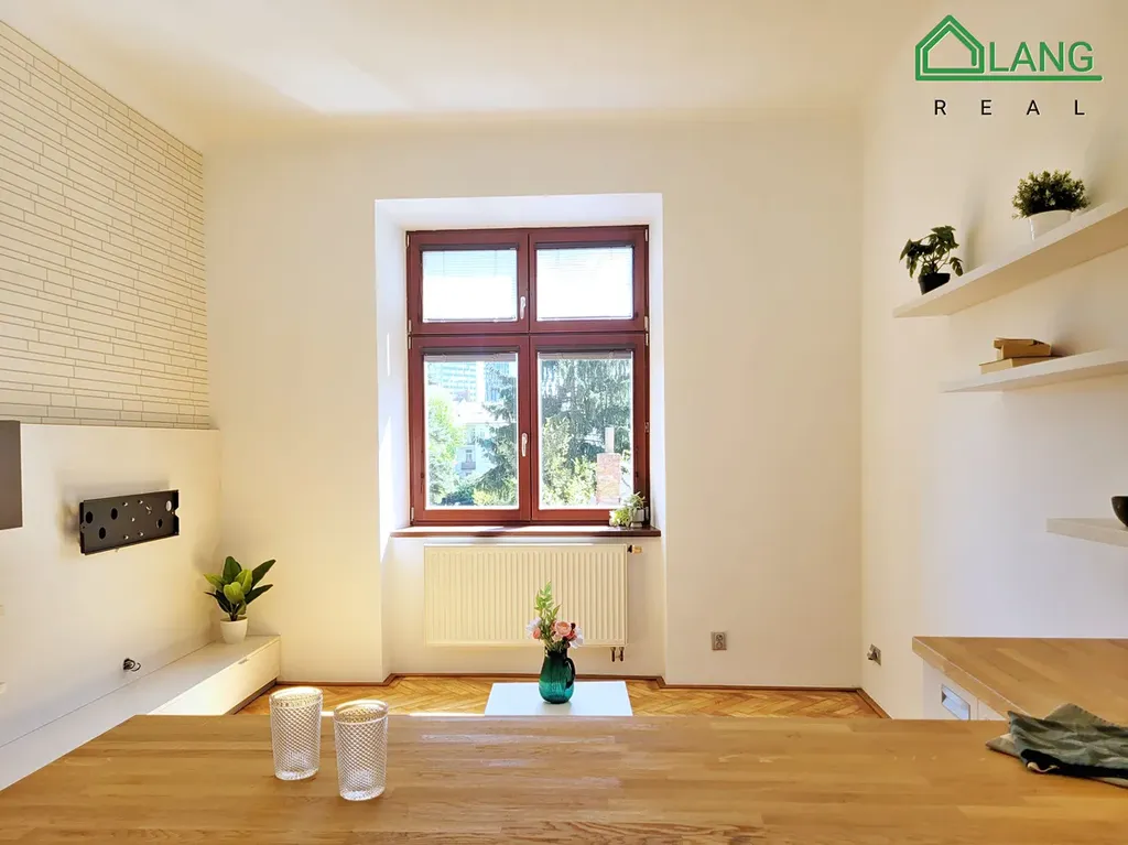 Výhled do zeleného klidného vnitrobloku má i pokoj s kuchyňským koutem. Pokoj je díky vysokým stropům vzdušný, prostorný, je zařízen obývací stěnou s úložnými prostory a nástěnným držákem na televizor, konferenčním stolkem a kvalitními policemi s masivu. Kuchyňský kout na míru má všechny potřebné spotřebiče, velkou pracovní plochu s dřevěným povrchem, je vybaven velkým množstvím skříněk a šuplíků a kvalitním osvětlením nad linkou.