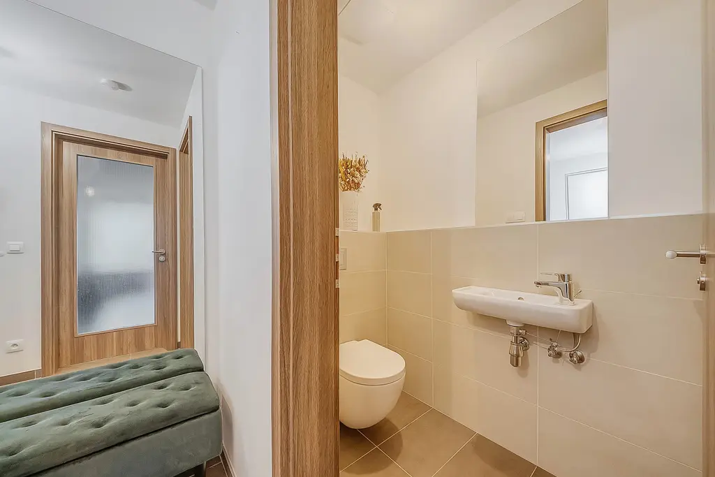 This beautiful apartment is located on the 11th floor of a new building in the sought-after developing area in Prague 3. A limited number of apartments per floor provide a good privacy and tranquility. A parking space for your car is located on the ground floor with easy access, so you don't have to spend time navigating narrow underground passageways. Right next to the parking space you will find a cellar - 4 m² for seasonal items or sports equipment and easy access to the elevator.