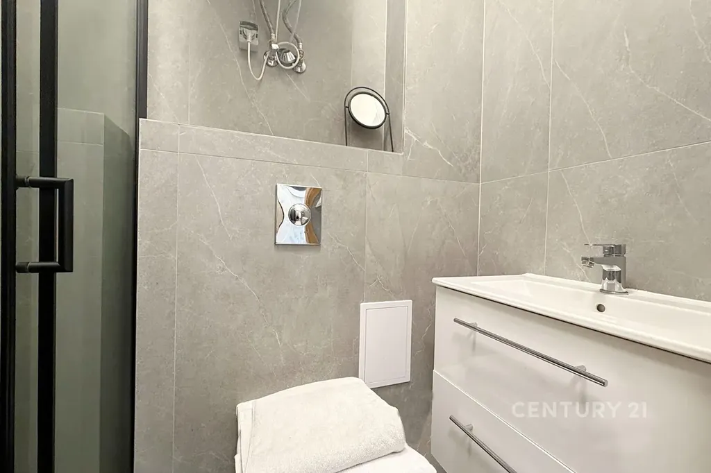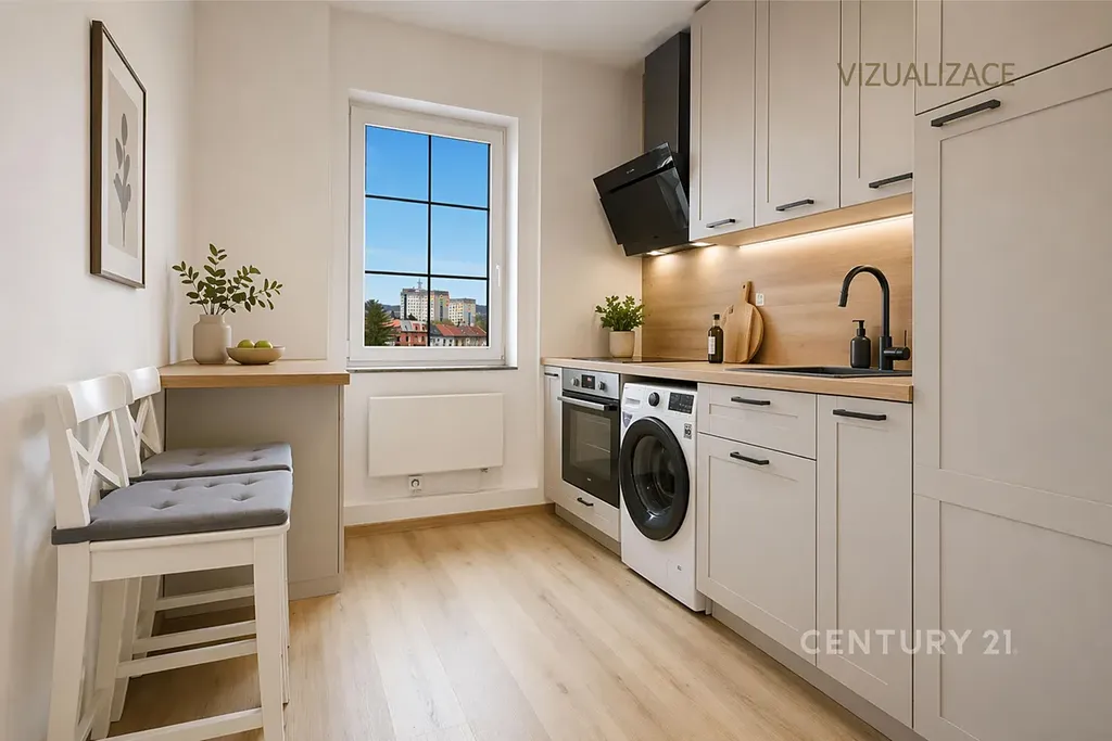 Stav po rekonstrukci: Byt prošel modernizací, má novou koupelnu se sprchovým koutem v elegantním šedém provedení, moderní kuchyňskou linku a nové podlahy.