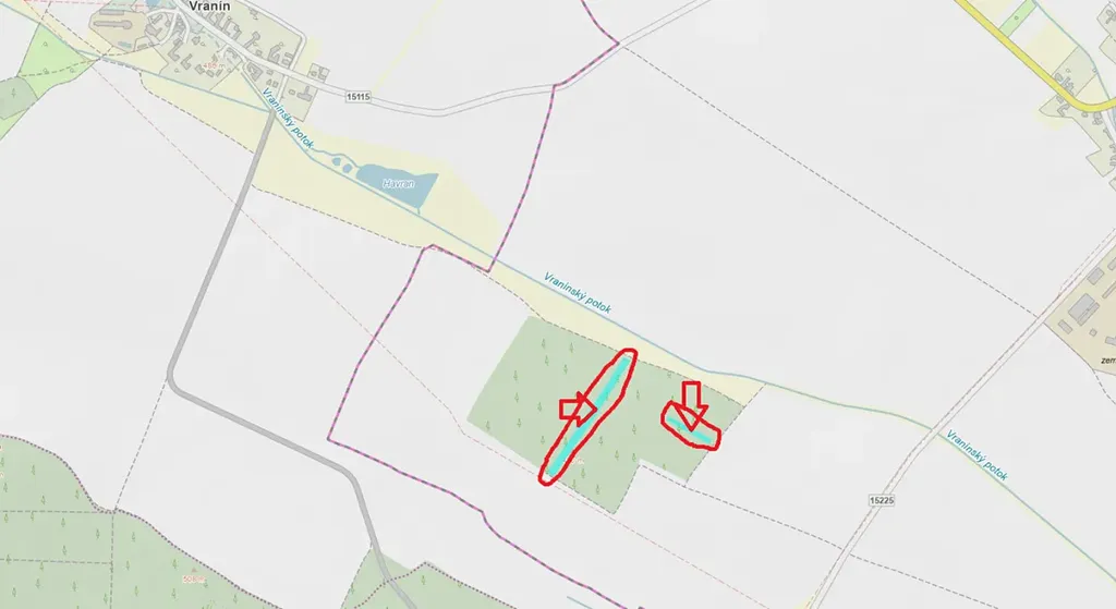 - p.č. 675 vedená jako lesní pozemek o celkové výměře 6 103 m2, z toho vlastníme podíl 1/4 tedy 1 526 m2.