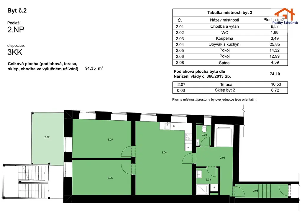 Tento byt s dispozicí 3+KK se nachází ve 2.NP. Celková plocha je složena z podlahové plochy bytu 74,1 m², terasy 10,5 m² a sklepu 6,7 m². V této bytové jednotce budou zachovány pouze nosné konstrukce a proběhne kompletní rekonstrukce bytu včetně veškerých instalací. Při včasné rezervaci budou umožněny klientské změny a kupující tak může získat byt s vybavením a materiály na míru dle svých představ.