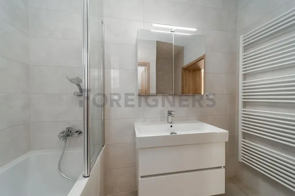 Koupelna s vanou, umyvadlem se skříňkou a zrcadlem, otopným žebříkem. Samostatnou toaletou a úklídovou místností s umyvadlem.