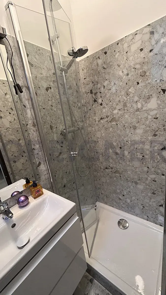 Koupelna se sprchovým koutem a novou pračkou, oddělený záchodElektrické topení