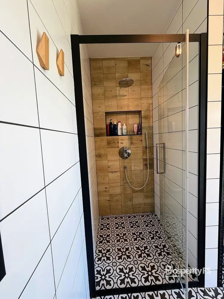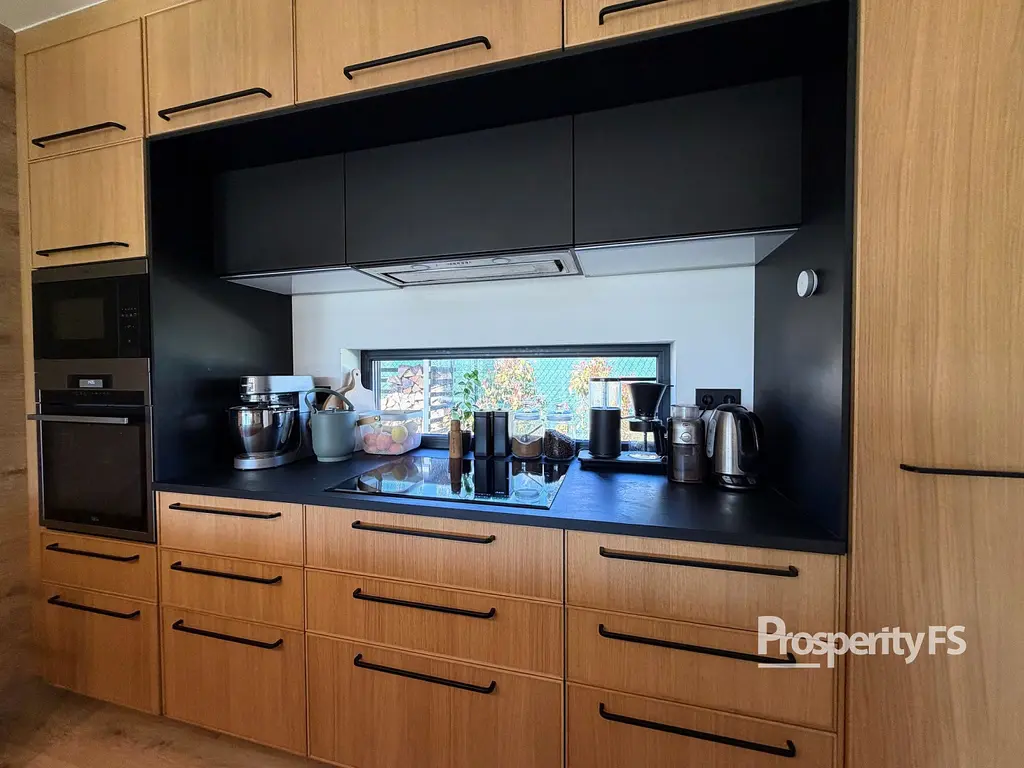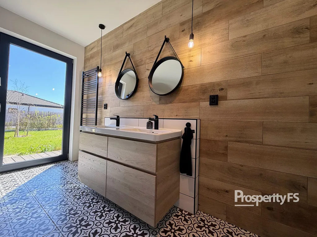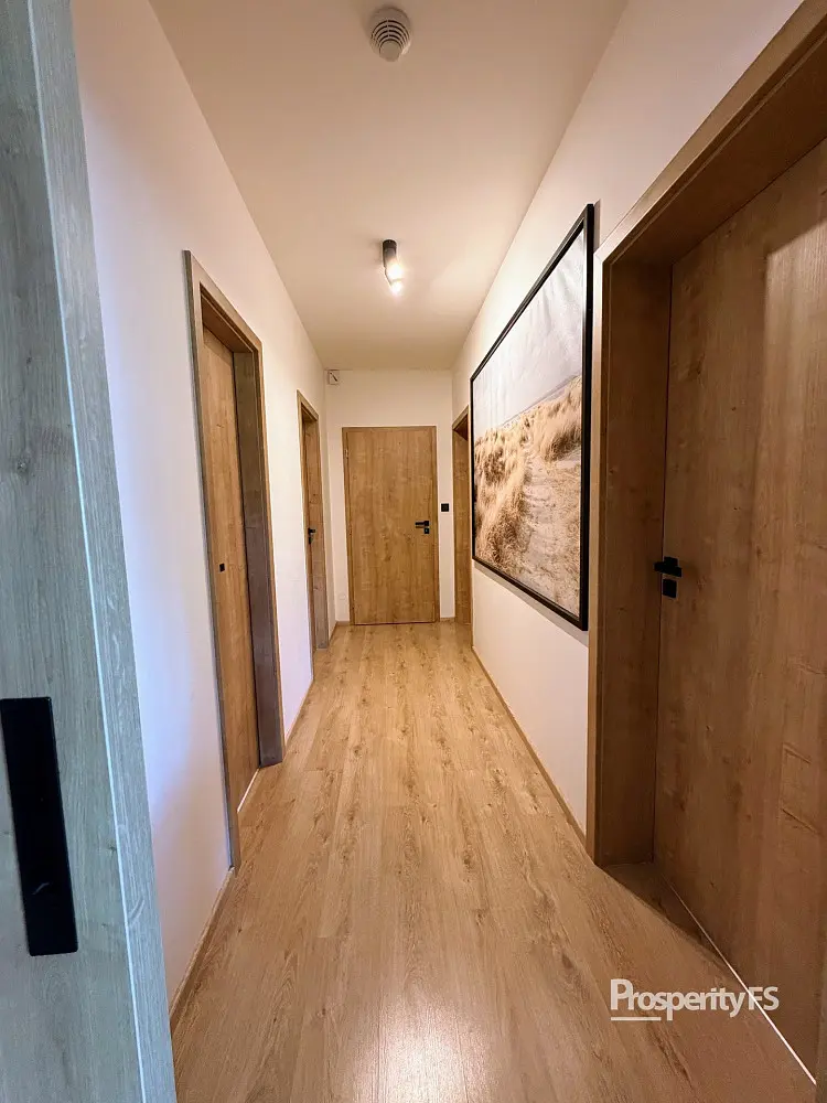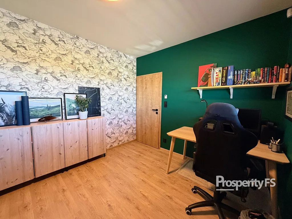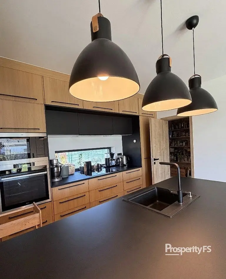Přízemí: Vstupní chodba, pracovna, WC, koupelna, technická místnost. Dominantou je obývací pokoj s kuchyní, jídelním koutem a ložnice s vlastní soukromou koupelnou a WC. Kuchyně je plně vybavena vestavěnými spotřebiči (indukce, elektrická trouba, digestoř), monoklimatickou lednicí a oddělenou spíží.
