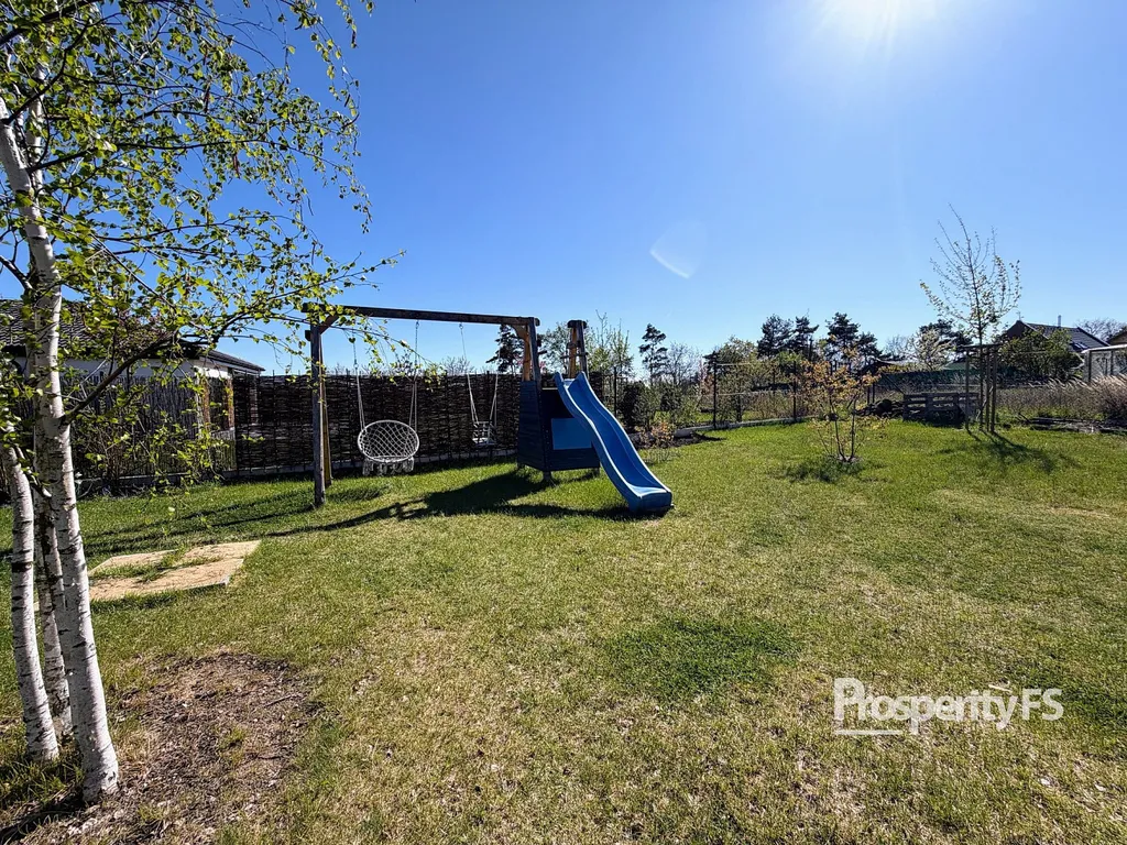 Zahrada o výměře 776 m² se skvělým zázemím pro děti: dětské hřiště s houpačkami, klouzačkou a pískovištěm.