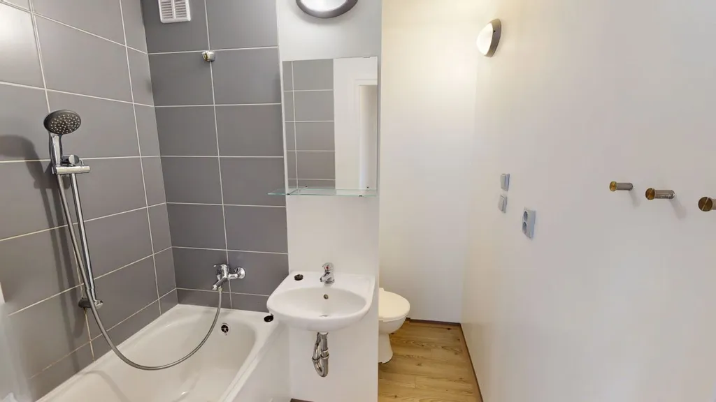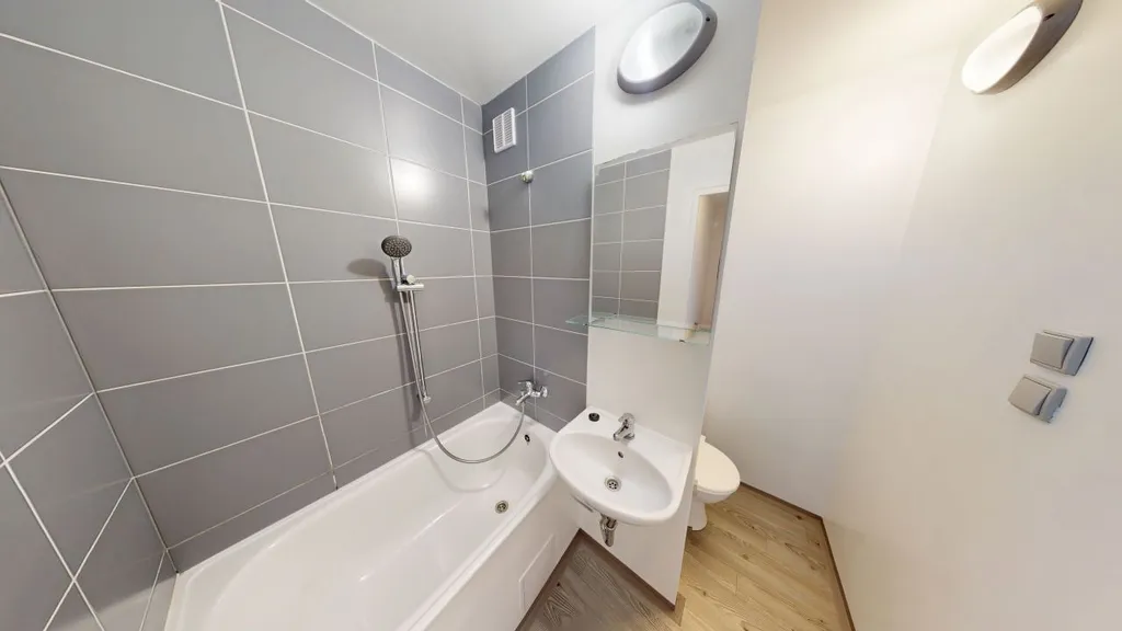 Koupelna disponuje vanou, umyvadlem a osvětlením, toaleta je součástí koupelny.