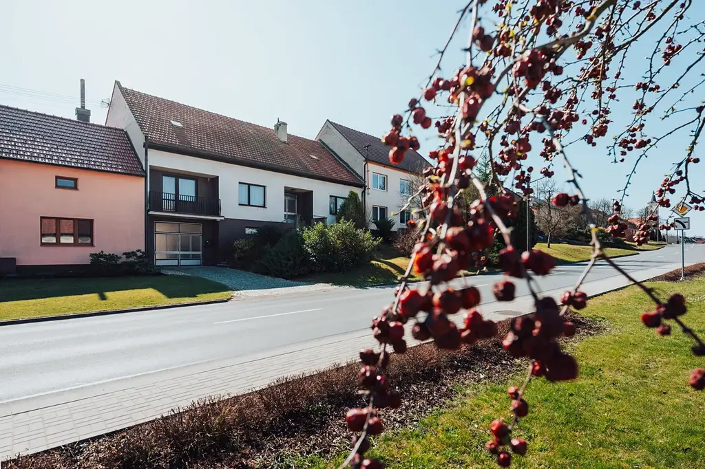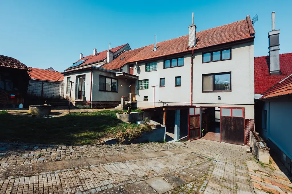 Za domem se otevírá klidný dvorek, zahradní domek, stodola, a především udržovaná zahrada se vzrostlými stromy.