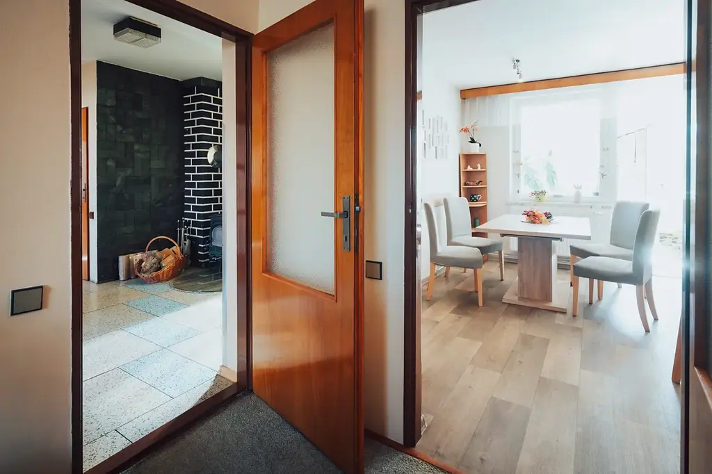 Dominantou domu je obytné podlaží s prostornou halou s krbovými kamny, obývacím pokojem a zimní zahradou s přímým vstupem na zahradu – ideální místo pro každodenní život i společné chvíle.