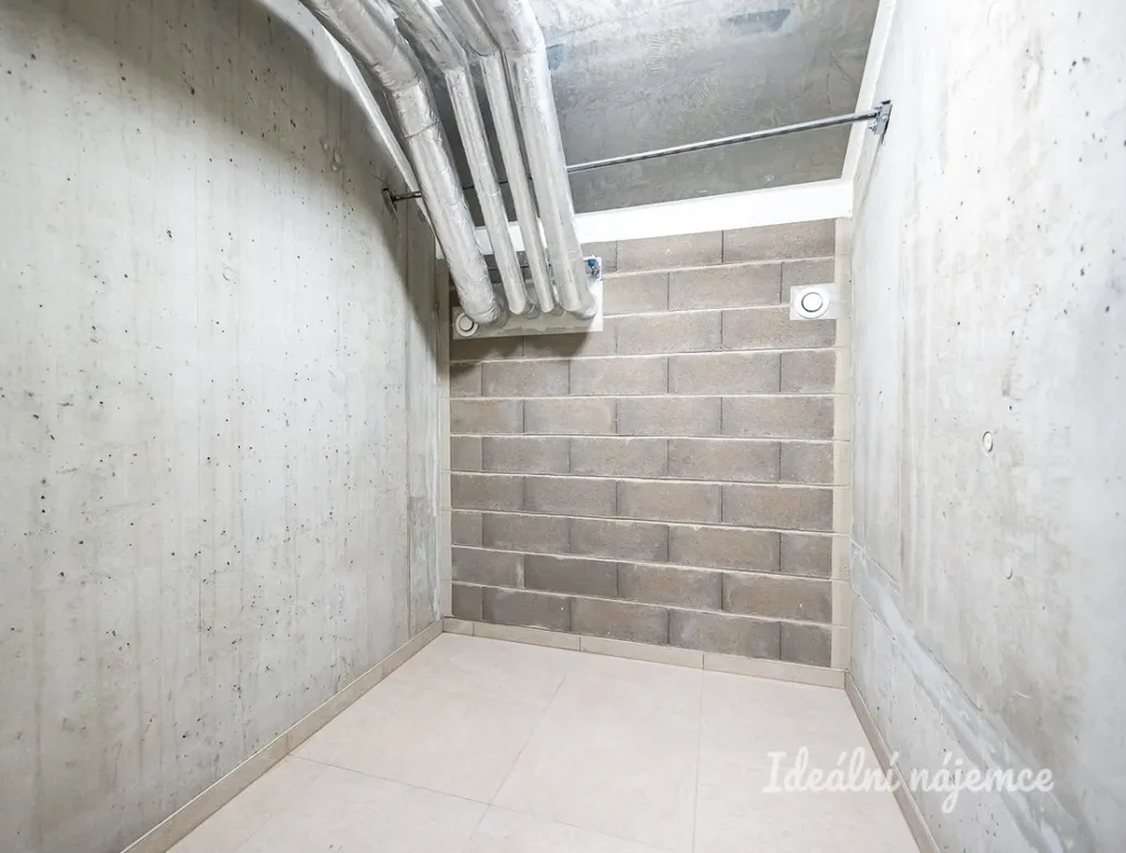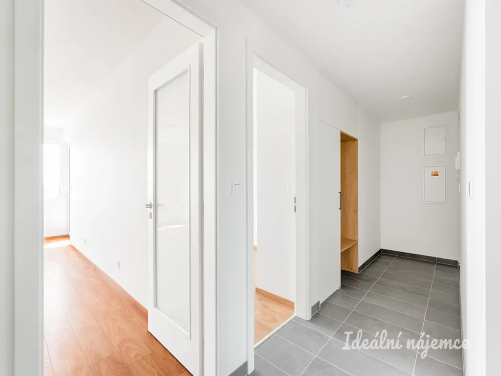V předsíni se nachází vestavěná šatní skříň s věšákem. Z předsíně se dostaneme do obývacího pokoje s kuchyňským koutem. Kuchyně se nabízí plně vybavena vestavnými spotřebiči - lednice s mrazákem, myčka nádobí, indukční varná deska, elektrická trouba a digestoř značek Electrolux a Liebherr. Obývací pokoj i ložnice jsou nezařízené. V koupelně se nachází sprchový kout, závěsná sanita a přípojka s vývodem na pračku. Okna jsou zde kvalitní trojskla s výbornou tepelnou i zvukovou izolací.